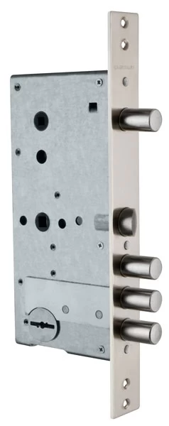 Замок врезной сувальдный ЗВ 5015 с защелкой и задвижкой предназначен для установки в металлические двери, шкафы и сейфы. Универсальные - переворот защелки без разборки замка. Бронепластина надежно защищает от высверливания. Повышенная защита от наиболее распространенных методов вскрытия: самоимпрессии (самоноборного ключа) - втулка на корпусе и крышке замка; отмычки - ложные пазы на стойке и сувальдах, увеличенная жесткость пружин сувальд; "свертыша" - ослабленный зуб рейки хвостовика; взлома - при полностью выдвинутых ригелях замка 30% их длины остается в корпусе замка, усилена конструкция засовов; высверливания - внешняя бронепластина, закаленная стойка рейки хвостовика; вандалов - отсутствие нижней стенки корпуса замка. Замок комплектуется 4 длинными ключами.